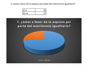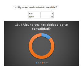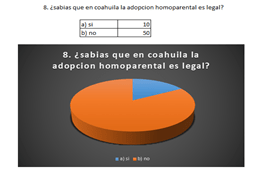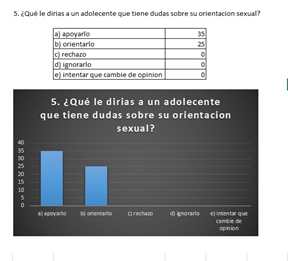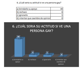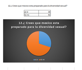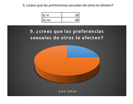 Tomando en cuanta el porcentaje de las personas encuestadas se obtuvo que el las personas de orientación sexual diferente al hombre/mujer nacen con ese «gusto» o preferencia, como también que las personas pueden combatir la homofobio tomando pláticas, o alguna orientación, como también las preferencias sexual no afecta en la sociedad como lo hacían ver las personas que no los aceptaba, haciendo ver sus derechos tal cuales hacía esas personas no debe ser ser visto de mala manera por que tan cual las personas con esa orientación puedes hacer y tomar las mismas decisiones que una persona heterosexual. En el siglo XX ya no debe de ser visto, ni discriminar alas personas «gay’s» ya que se está haciendo leyes a su favor. Y así poder cambiar la forma de personas de los «machos». «Así como nuestros políticos carecen de sentido del ridículo, la mayor parte de las comunidades autónomas han publicado leyes a favor de la ideología de género. Por su repercusión tomo como referencia la ley madrileña, es decir la “Ley 3/2016, de 22 de julio de protección integral contra la LGTBIfobia y la discriminación por razón de orientación e identidad sexual en la Comunidad de Madrid”